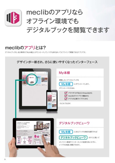 meclibのアプリならオフライン環境でもデジタルブックを閲覧できますmeclibのアプリとは?デジタルブックを、自分専用の「My本棚」にダウンロードしていつでも持ち歩いてオフラインで閲覧できるアプリです。デザインが一新され、さらに使いやすくなったインターフェースMy本棚閲覧したいデジタルブックをMy本棚にダウンロードします。ダウンロードの方法は、ブラウザ(HTML5)のmeclibからmeclibのライブラリ機能からアプリの企業ライブラリからのどれでもOK!デジタルブックビューワMy本棚にあるブックの表紙を選択すればデジタルブックビューワがすぐに開いてオンライン環境やインターネットの速度を気にせずに、いつでも快適に閲覧できます。5