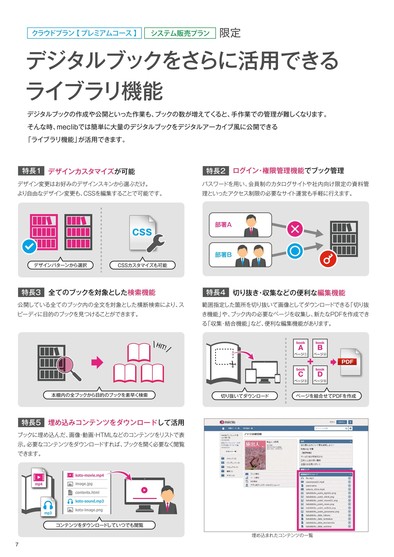 クラウドプラン【プレミアムコース】システム販売プラン限定デジタルブックをさらに活用できるライブラリ機能デジタルブックの作成や公開といった作業も、ブックの数が増えてくると、手作業での管理が難しくなります。そんな時、meclibでは簡単に大量のデジタルブックをデジタルアーカイブ風に公開できる「ライブラリ機能」が活用できます。特長1デザインカスタマイズが可能特長2ログイン・権限管理機能でブック管理デザイン変更はお好みのデザインスキンから選ぶだけ。より自由なデザイン変更も、CSSを編集することで可能です。パスワードを用い、会員制のカタログサイトや社内向け限定の資料管理といったアクセス制限の必要なサイト運営も手軽に行えます。CSS部署A部署Bデザインパターンから選択CSSカスタマイズも可能特長3全てのブックを対象とした検索機能特長4切り抜き・収集などの便利な編集機能公開している全てのブック内の全文を対象とした横断検索により、スピーディに目的のブックを見つけることができます。範囲指定した箇所を切り抜いて画像としてダウンロードできる「切り抜き機能」や、ブック内の必要なページを収集し、新たなPDFを作成できる「収集・結合機能」など、便利な編集機能があります。HIT!bookAbookBページ①ページ④bookCbookDページ③ページ⑨PDF本棚内の全ブックから目的のブックを素早く検索切り抜いてダウンロードページを組合せてPDFを作成特長5埋め込みコンテンツをダウンロードして活用ブックに埋め込んだ、画像・動画・HTMLなどのコンテンツをリストで表示。必要なコンテンツをダウンロードすれば、ブックを開く必要なく閲覧できます。コンテンツをダウンロードしていつでも閲覧5埋め込まれたコンテンツの一覧