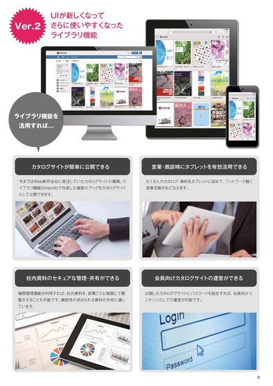 Ver.2UIが新しくなってさらに使いやすくなったライブラリ機能ライブラリ機能を活用すれば...カタログサイトが簡単に公開できる営業・商談時にタブレットを有効活用できる今まではWeb制作会社に発注していたカタログサイトの構築。ライブラリ機能はmeclibで作成した複数のブックをカタログサイトとして公開できます。たくさんのカタログ・資料をタブレットに収めて、フットワーク軽く営業活動がおこなえます。社内資料のセキュアな管理・共有ができる会員向けカタログサイトの運営ができる権限管理機能を利用すれば、社内資料を、部署ごとに制限して閲覧させることも可能です。機密性の求められる資料の共有に適しています。公開したカタロググサイトにパスワードを設定すれば、会員向けコンテンツとしての運営が可能です。8
